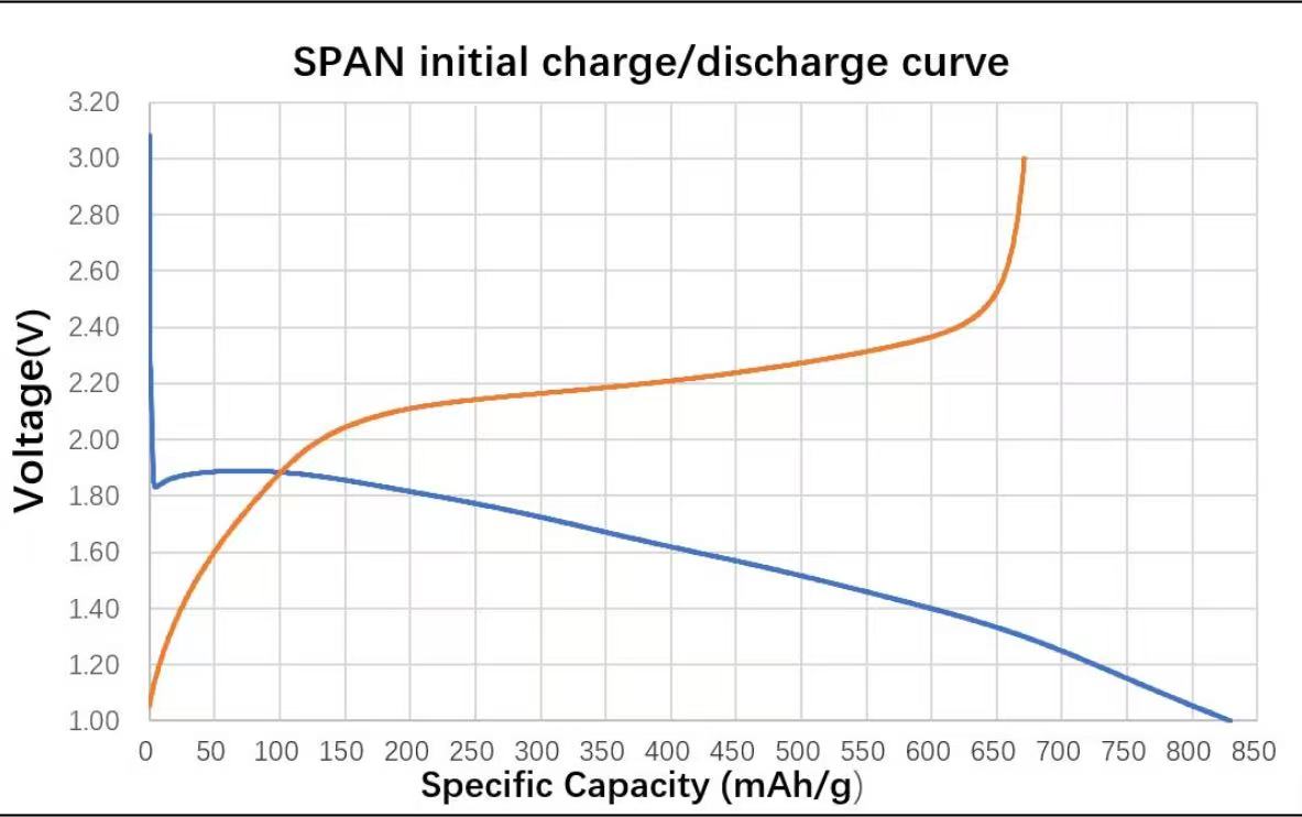 Alt text: Initial charge/discharge curve of SPAN cathode at 0.1C showing ~2.0 V discharge plateau.