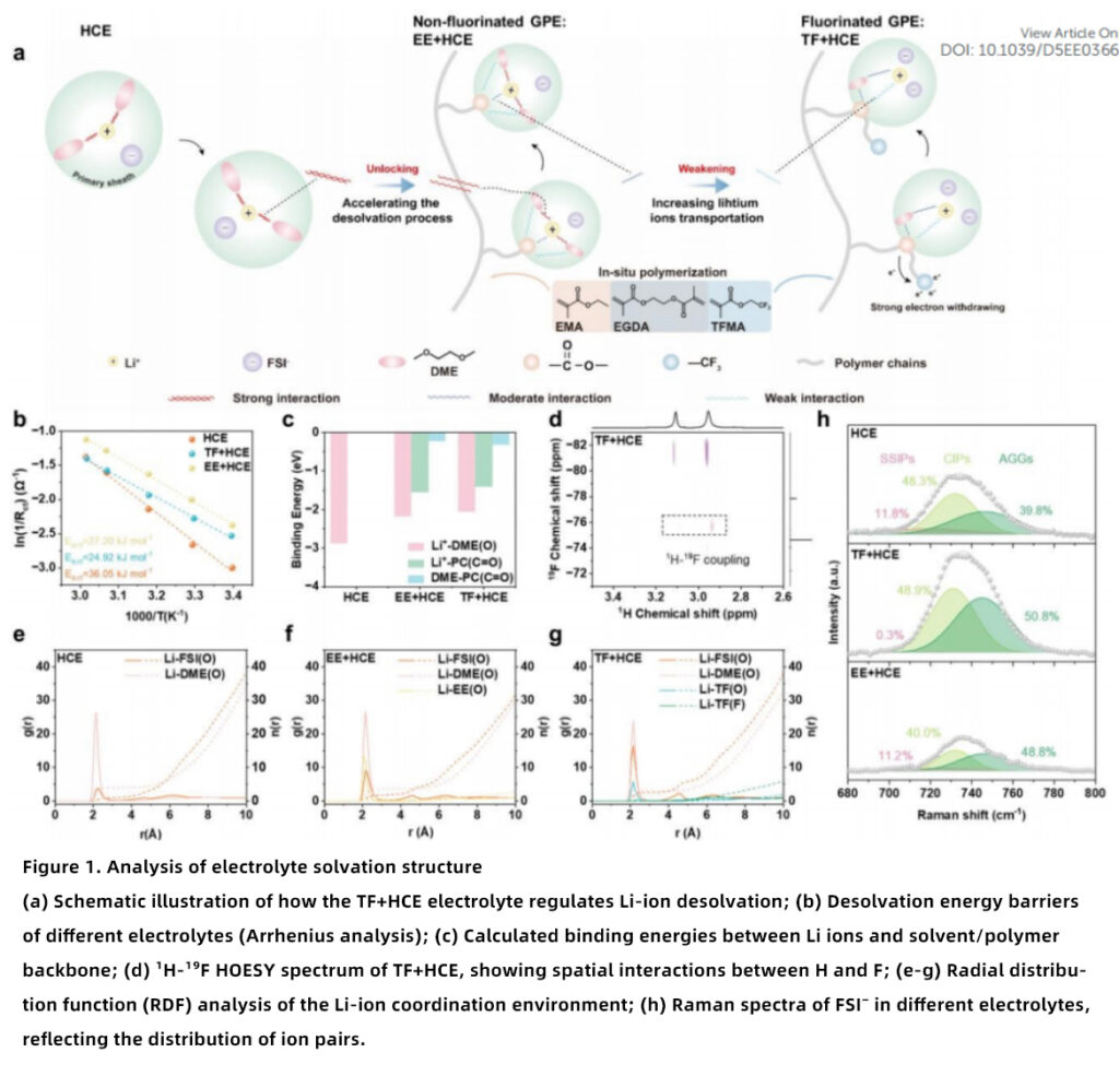 The desolvation energy of TF+HCE (24.92 kJ mol⁻¹) is significantly lower than that of HCE (36.05 kJ mol⁻¹) and EE+HCE (27.20 kJ mol⁻¹). The electron-withdrawing -CF₃ groups weaken the coordination between Li ions and ester groups, reducing desolvation resistance and improving Li-ion transport kinetics.