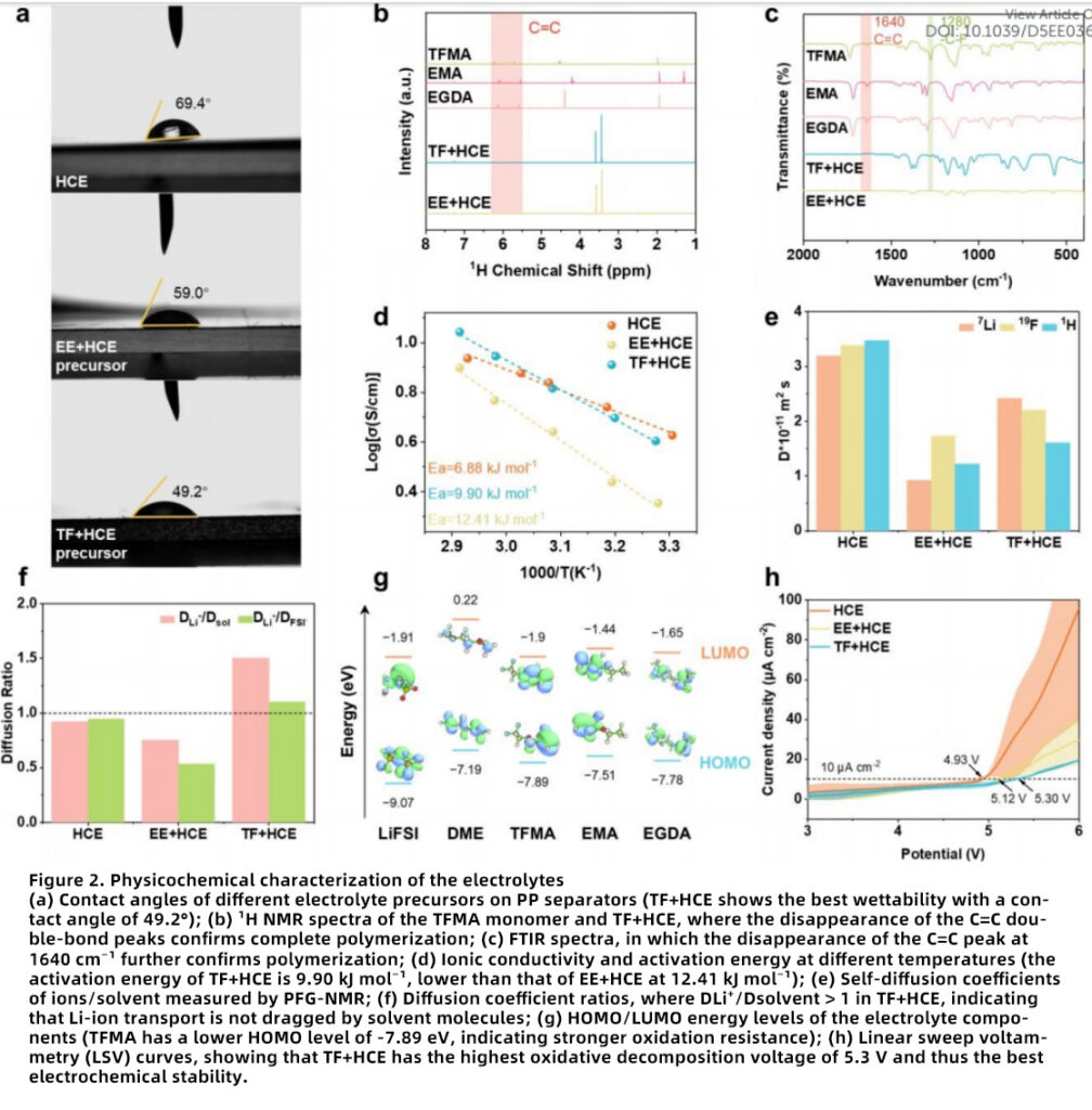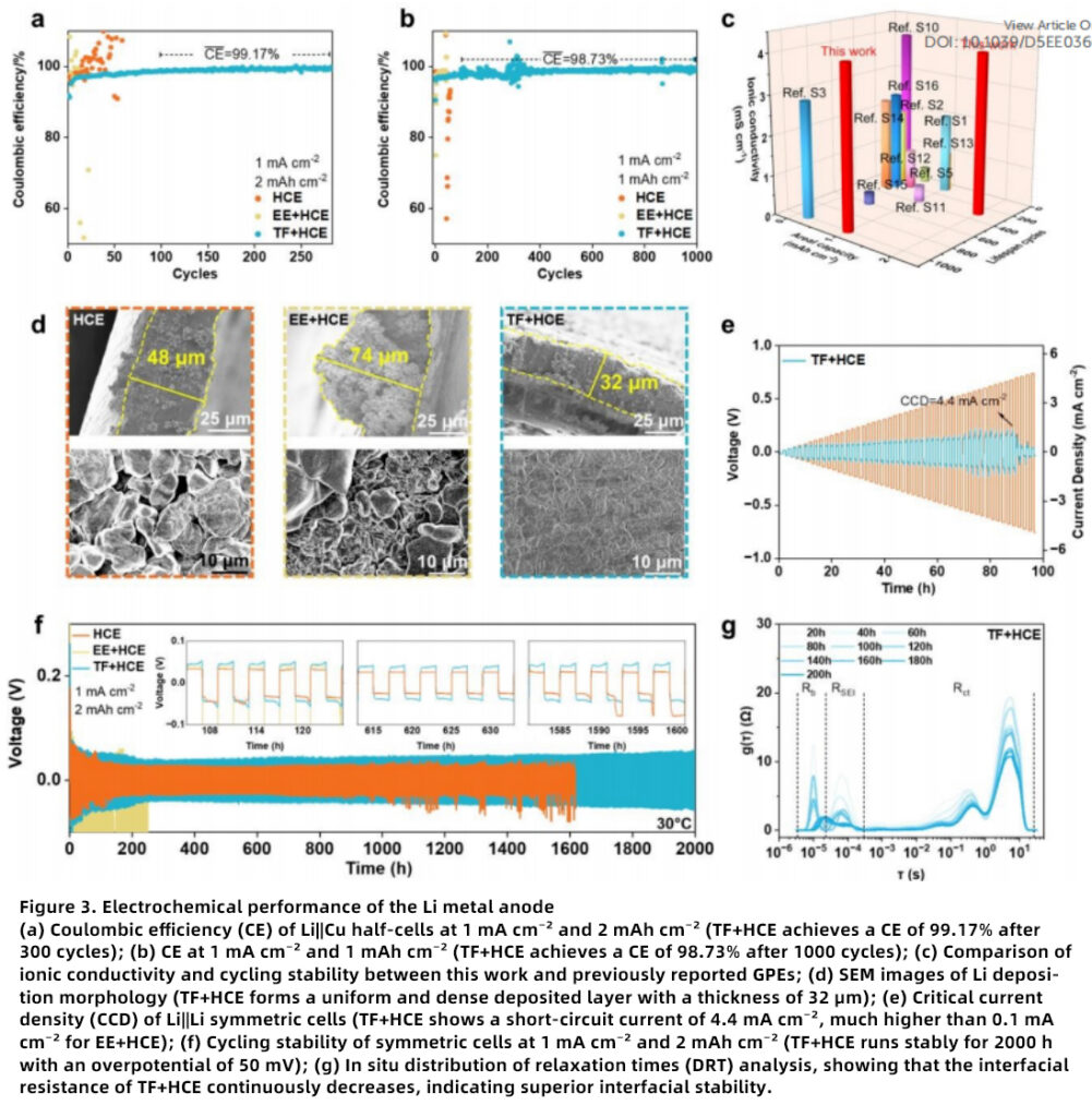 At room temperature, TF+HCE achieves an ionic conductivity of 4.02 mS cm⁻¹, close to that of HCE, while delivering a higher Li-ion transference number of 0.63. This makes it attractive for fast Li-ion transport, high-rate lithium batteries, and long-cycle electrolyte systems.