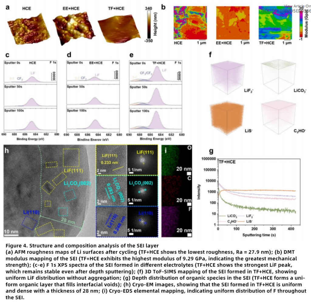 The SEI formed in TF+HCE exhibits several desirable characteristics for lithium metal battery interface stabilization.