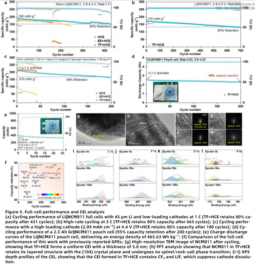 The practical relevance of TF+HCE is demonstrated in Li||NCM811 full-cell research and pouch-cell battery systems.